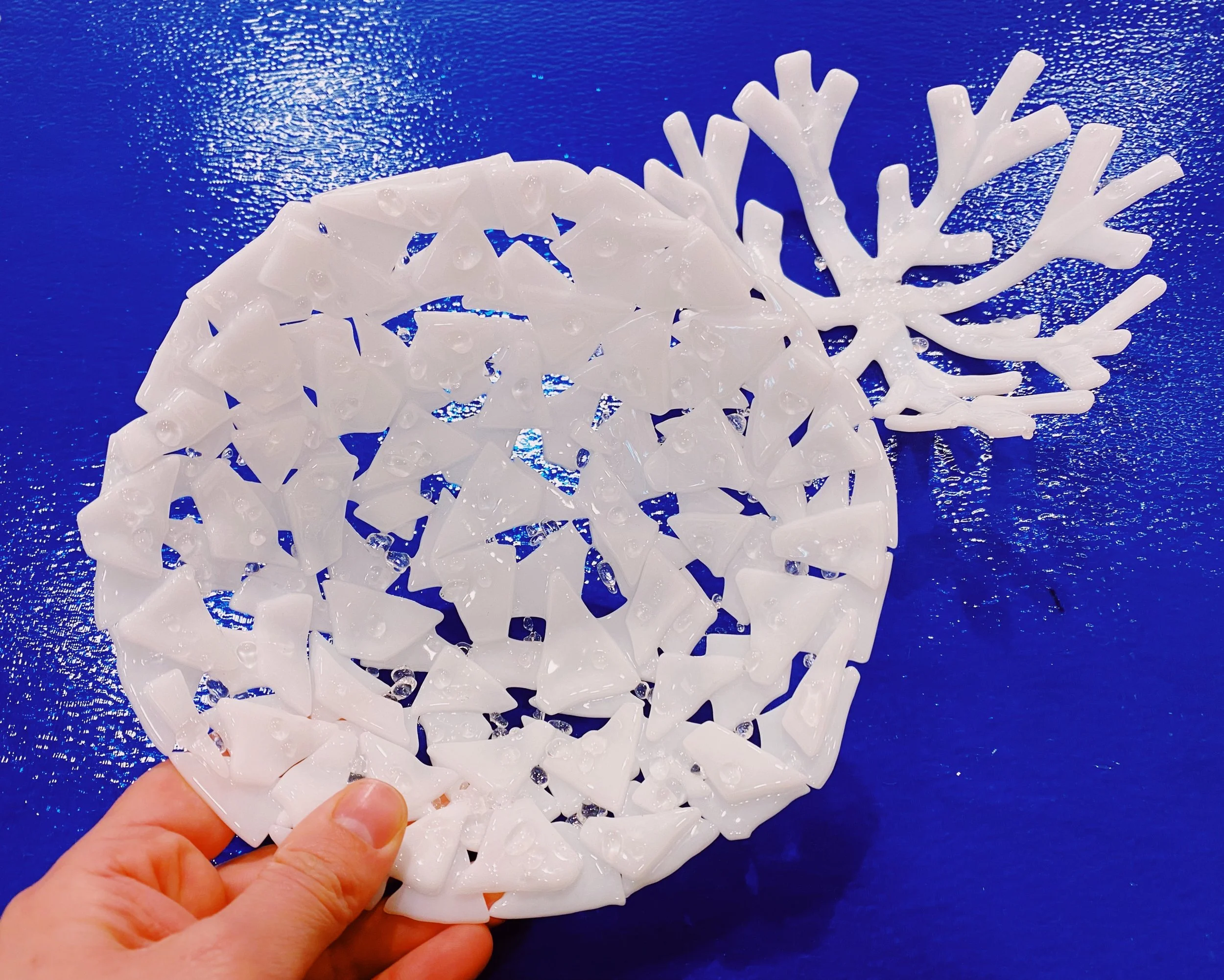 Learn how to design, assemble and break glass to create your own ice bowl. Final product is 7” round. Each piece will be fired in the kiln twice. Once flat and once to slump into a bowl shape.